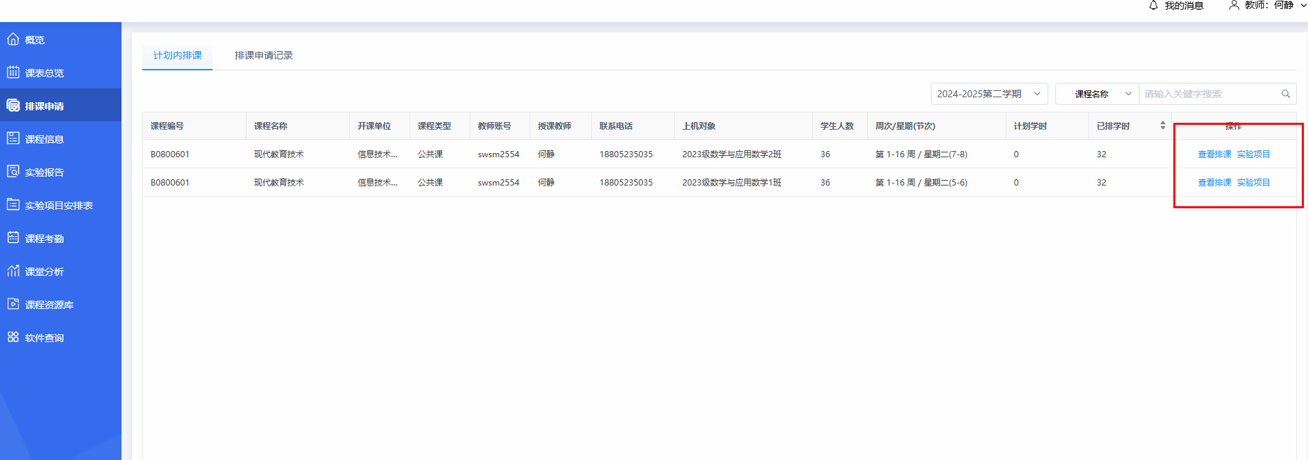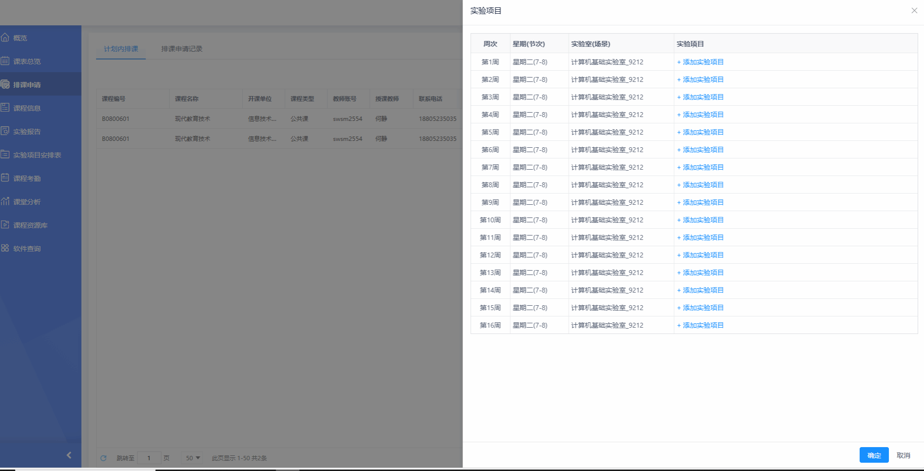 1.进入排课申请里面查看排课课程信息,点击实验项目可将建立好的实验项目排进课程。
