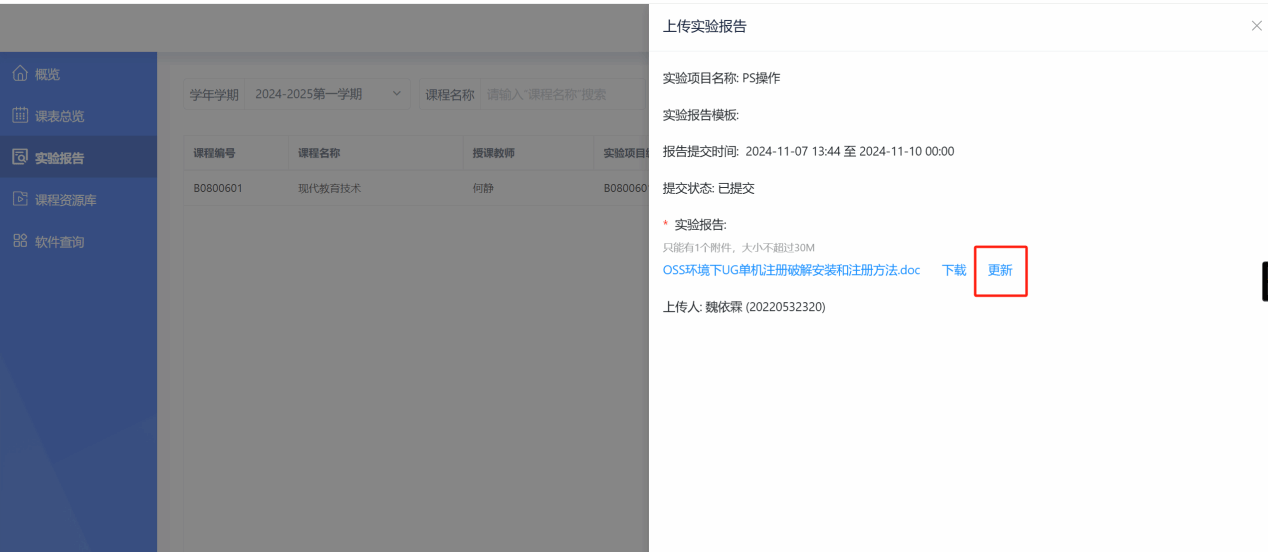 在实验报告截止时间前,都可以更新重新上传实验报告(点击更新,即可重新上传实验报告),直接覆盖原版实验报告,若因超时上传不了系统,联系任课老师。