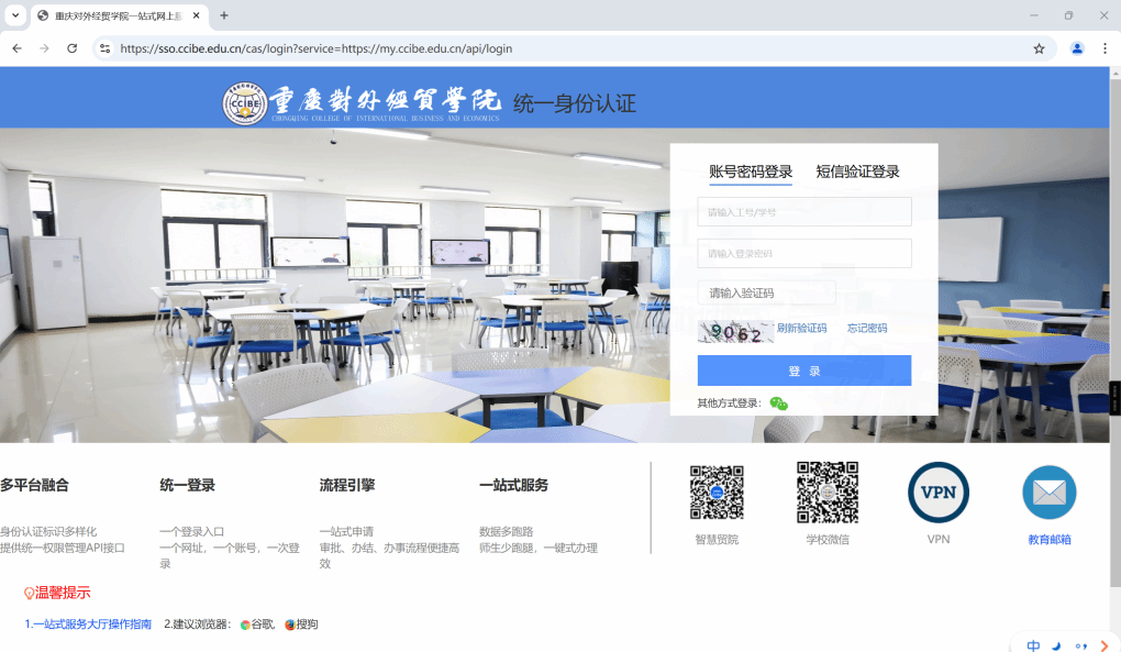 (一)打开学校“一站式服务大厅(https://my.ccibe.edu.cn/)”登录页面,或直接登录实验教学管理系统网址https://sygl.ccibe.edu.cn:7735/(校外网登录实验教学管理系统需通过VPN进入一站式服务大厅找到“实验管理”):