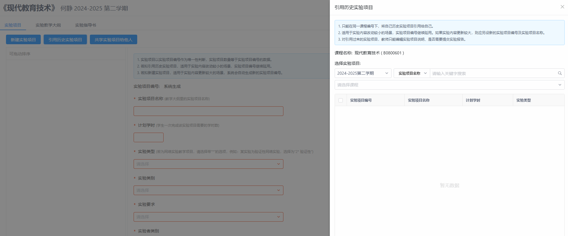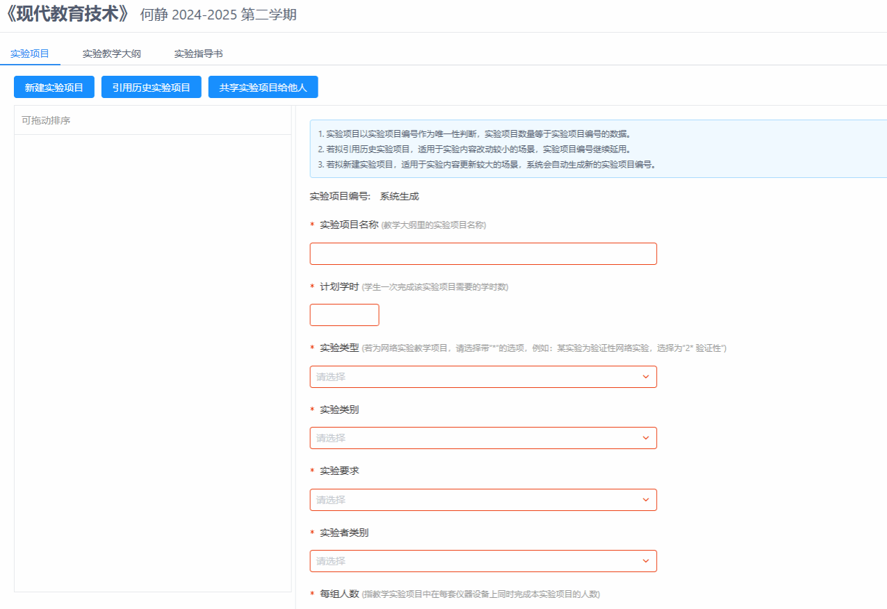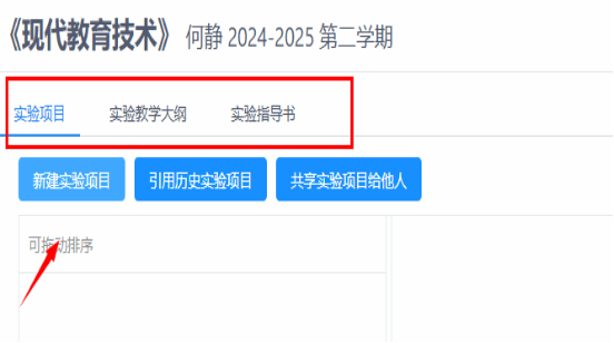 同课程下,新建的实验项目可以共享给同课程的其他老师(可由课程负责人创建本课程的实验项目,共享给该课程下的其他老师),自己创建的实验项目,可以引用到同课程的不同班级进行使用,也可以根据不同班级新建实验项目,因材施教)。