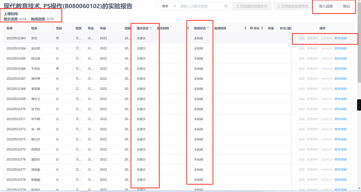 2.项目发布以后,可查看目前课程下学生实验报告提交情况,并进行报告批阅、修改成绩、补交等操作,导出原始实验包(学生上传的实验报告原件)。
