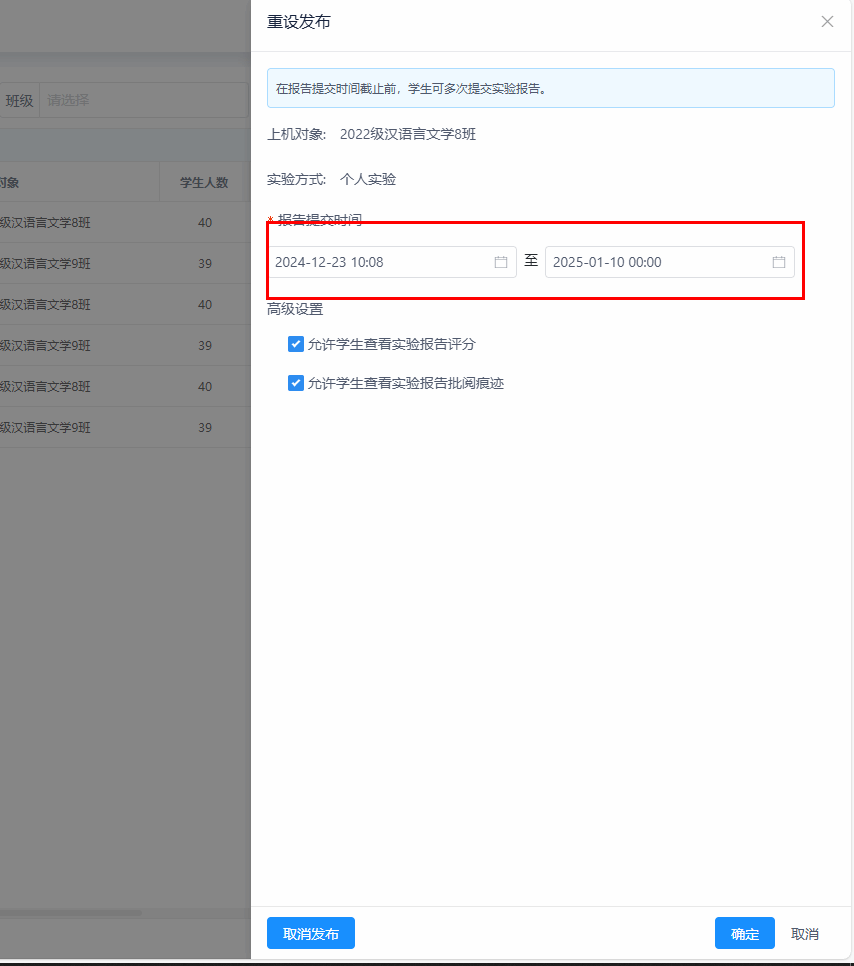 创建好实验项目,可以点击“实验报告”,可以针对实验项目,点击“发布”,可以选择实验报告提交开始与截止时间,以及是否可以让学生预览“批阅后实验报告”。