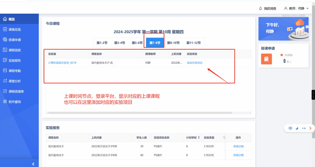 3.也可在上课时间阶段,登录平台概览中看到当前课程,直接添加对应的实验项对应该课程。